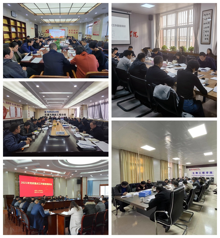 为进一步深化党史学习教育,强化党建引领,深入推进双高建设与提质培优行动计划,11月8日至15日,党委书记陈宁,党委副书记、校长王周锁,党委副书记任得元,党委副书记、纪委书记王勇胜,副校长祝战斌等带领党政办公室、党委组织部、党委宣传部、纪委综合办、党委学工部、发展规划处、教务处、产教融合处、人事教师处、科技与教育研究处、国际合作交流处、继续教育学院等部门负责同志组成督查调研组,深入学校14个教学单位,通过听取汇报、座谈交流、查阅资料等方式,对各学院(部)党政重点工作完成情况及发展思路进行了深入调查研究。