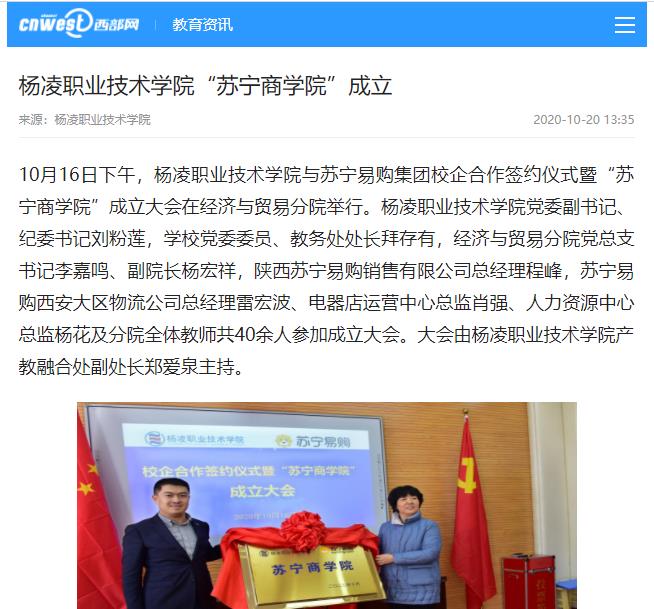 会上,刘粉莲与程峰共同为“苏宁商学院”揭牌,刘粉莲向程峰颁发客座教授聘书。拜存有宣布了“苏宁商学院”领导班子成员名单和主要职责。校企双方签订了《苏宁商学院合作协议书》。杨凌职院向苏宁易购集团授予“实践教学基地”和“师资培养基地”牌匾。苏宁易购集团授予杨凌职院“苏宁易购人才培养基地”和“苏宁易购员工培训基地”牌匾。肖强代表苏宁易购向学校捐赠10台电脑,设立苏宁奖学金。