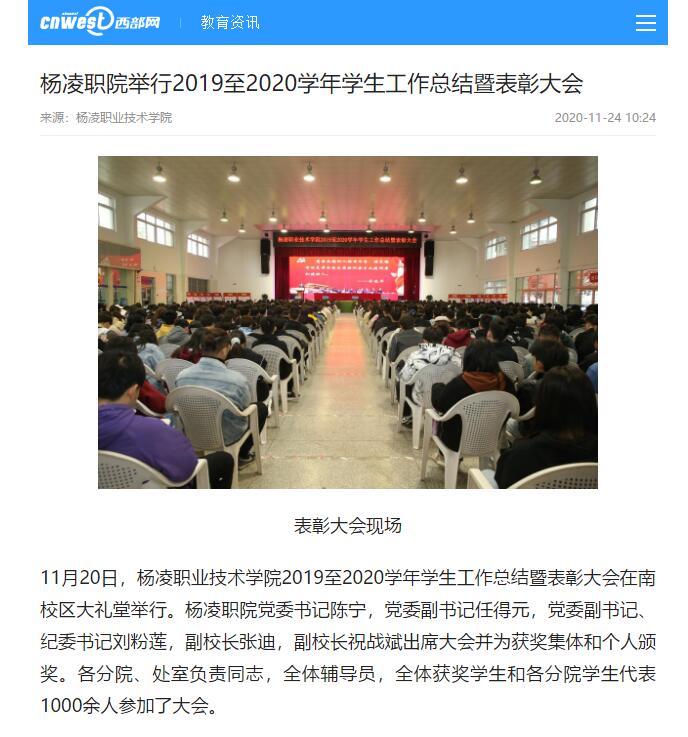 11月20日,KY.COM2019至2020学年学生工作总结暨表彰大会在南校区大礼堂举行。杨凌职院党委书记陈宁,党委副书记任得元,党委副书记、纪委书记刘粉莲,副校长张迪,副校长祝战斌出席大会并为获奖集体和个人颁奖。各分院、处室负责同志,全体辅导员,全体获奖学生和各分院学生代表1000余人参加了大会。